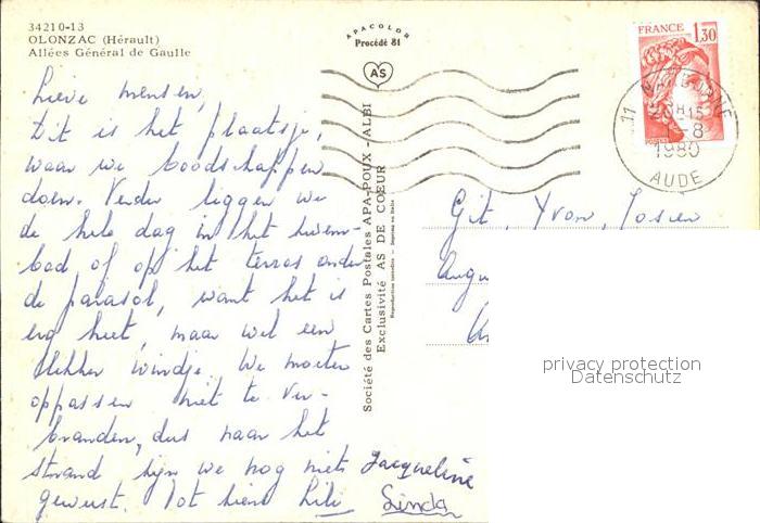 12325685 carte postale Olonzac Allees General de Gaulle postalisch gelaufen Erhaltung siehe scans KatCode: 11170034134189