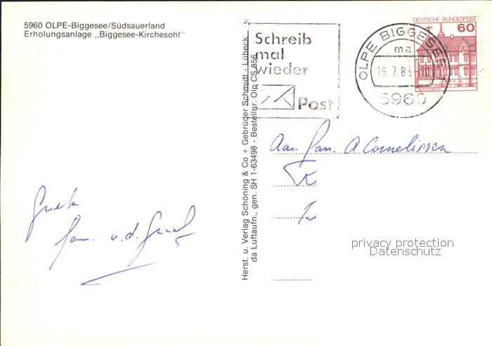 72231311 alte Postkarte Olpe Biggesee Erholungsanlage Biggesee- Kirchesohl Fliegeraufnahme postalisch gelaufen Erhaltung siehe scans KatCode: 11110005966024