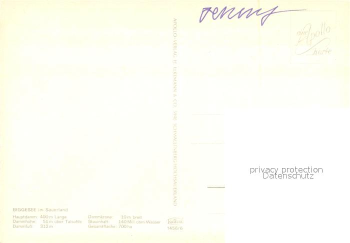 73310038 Olpe Biggesee Hauptdamm Stausee Talsperre postalisch nicht gelaufen Erhaltung siehe scans [FriedD77] KatCode: 11110005966024