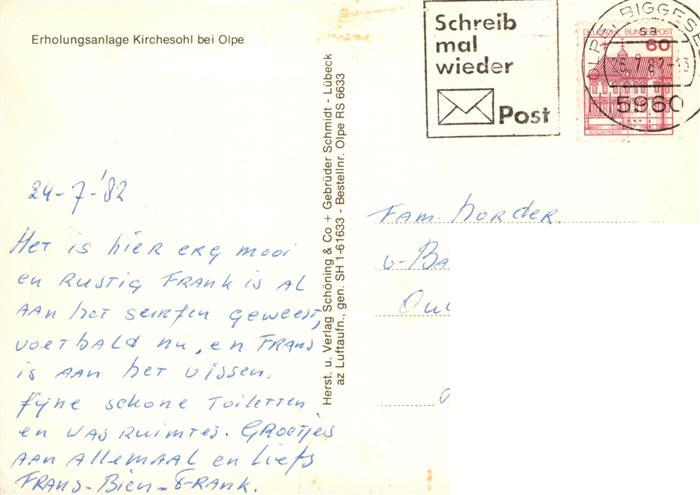 73944183 alte Postkarte Olpe Stadt Erholungsanlage Kirchesohl am Biggesee postalisch gelaufen Fliegeraufnahme Erhaltung siehe scans [WerneD78] KatCode: 11110005966024