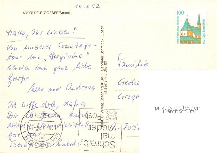 73835373 alte Postkarte Olpe Stadt Panorama mit Biggesee postalisch gelaufen Fliegeraufnahme Erhaltung siehe scans [FriedD77] KatCode: 11110005966024