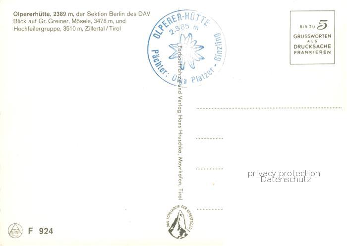 73836571 Olpererhuette 2389m Schwaz Tirol AT mit Gr Greiner Moesele und Hochfellngruppe postalisch nicht gelaufen Erhaltung siehe scans [WerneD78] KatCode: 11390335070926