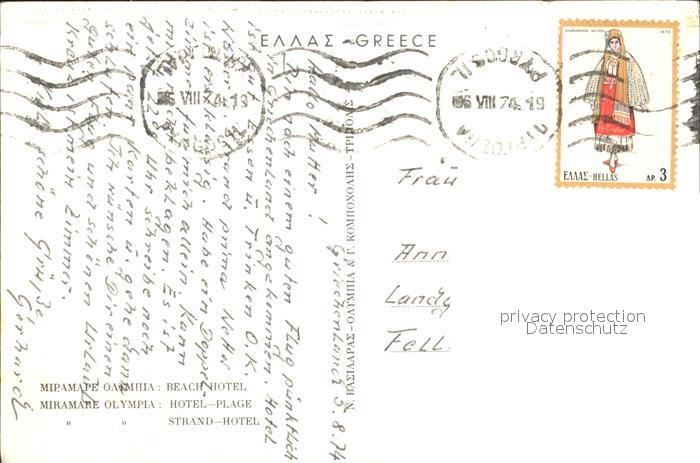 old postcard Olympia Griechenland Hotel Plage Miramare Olympia postalisch gelaufen Erhaltung siehe scans