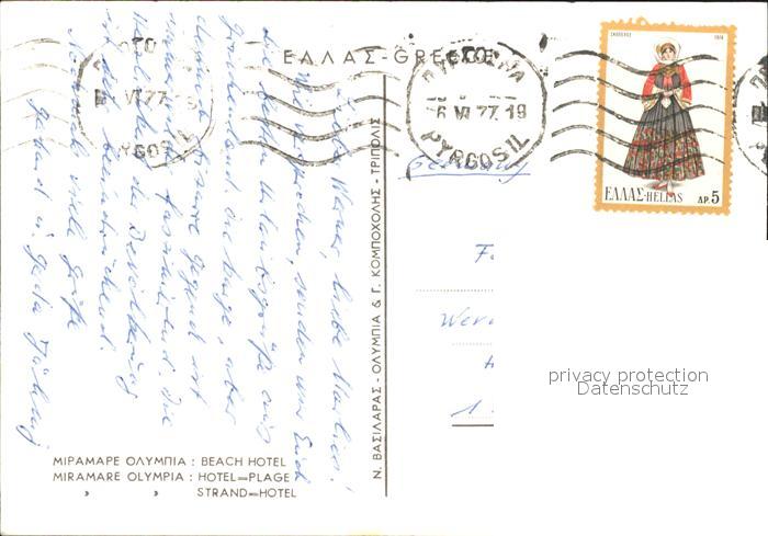 old postcard Olympia Griechenland Miramare Hotel Plage postalisch gelaufen