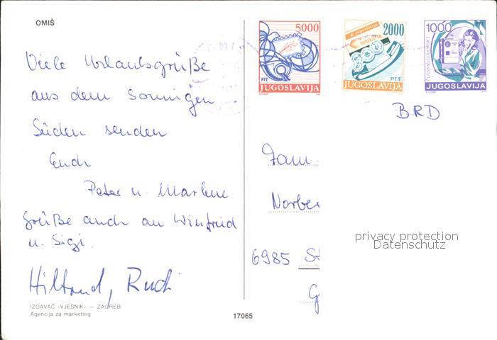 old postcard Omis Teilansicht Burgruine Campingplatz postalisch gelaufen Erhaltung siehe scans