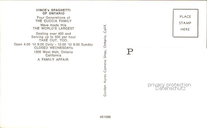 11688190 Ontario California Vince’s Spaghetti Restaurant postalisch nicht gelaufen Erhaltung siehe scans KatCode: 14140050000000