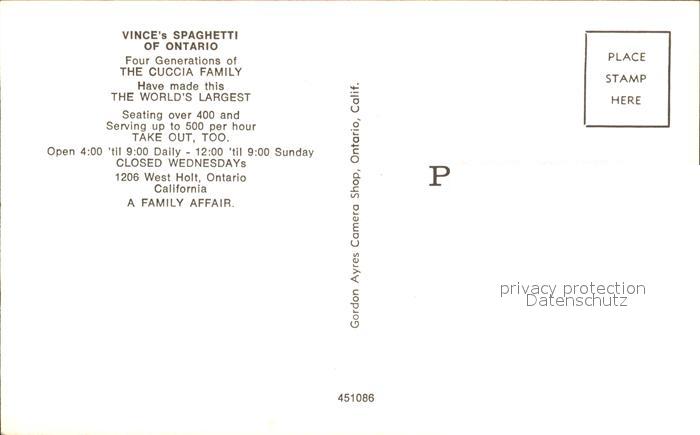 11688618 Ontario California Vince’s Spaghetti Restaurant postalisch nicht gelaufen Erhaltung siehe scans KatCode: 14140050000000