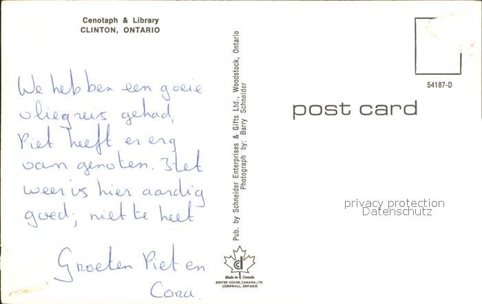 Ontario Canada Cenotaph and Library Clinton postalisch nicht gelaufen Erhaltung siehe scans