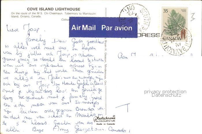 old postcard Ontario Canada Cove Island Lighthouse Fliegeraufnahme postalisch gelaufen Erhaltung siehe scans