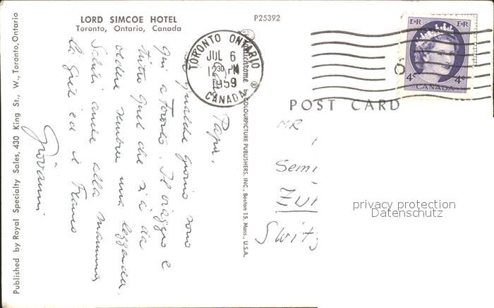 old postcard Ontario Canada Lord Simcoe Hotel Autos postalisch gelaufen Erhaltung siehe scans