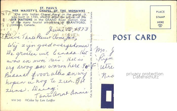 old postcard Ontario Canada St. Pauls her majestys chapel of the Mohawks postalisch gelaufen Erhaltung siehe scans