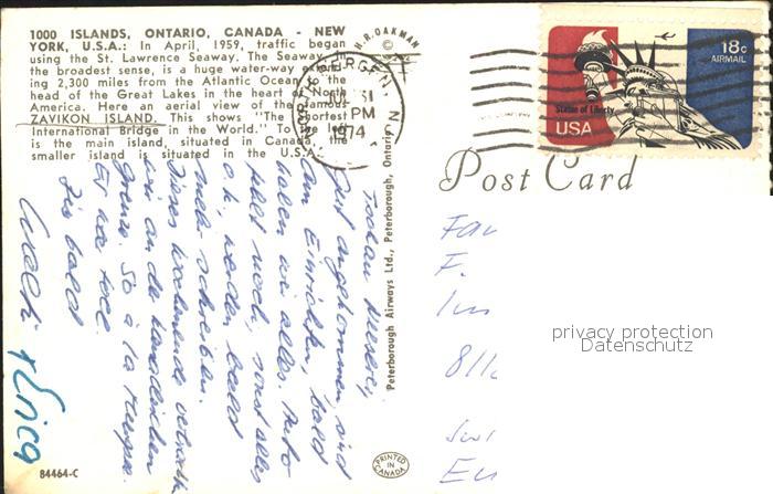 old postcard Ontario Canada Zavikon Island St Lawrence Seaway Ferry Boat aerial view postalisch gelaufen Erhaltung siehe scans