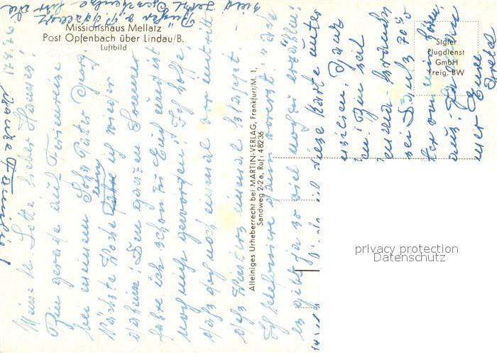 73643992 alte Postkarte Opfenbach Missionshaus Mellatz Fliegeraufnahme postalisch gelaufen Erhaltung siehe scans [WerneD78] KatCode: 11110009776122