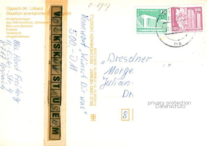 73039963 alte Postkarte Oppach Kinderferienlager Bieleboh Freibad Teilansicht Umgebindehaus postalisch gelaufen Erhaltung siehe scans [WerneD78] KatCode: 11110014286330