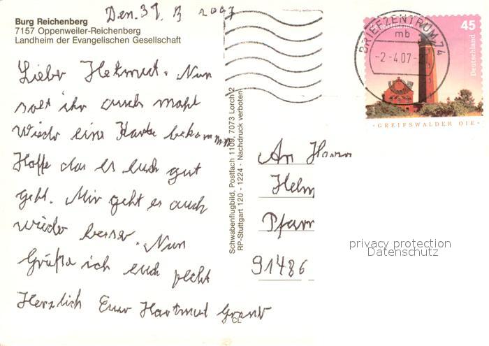 73662117 alte Postkarte Oppenweiler Burg-Reichenberg Fliegeraufnahme postalisch gelaufen Erhaltung siehe scans [LiesaD40] KatCode: 11110008119053