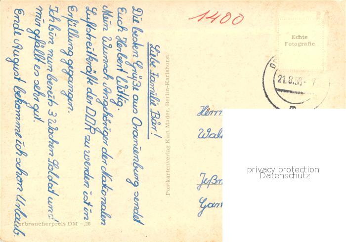 73754354 alte Postkarte Oranienburg Platz des Friedens Bahnhof Kirche Stalin-Allee Hotel Eilers postalisch gelaufen Erhaltung siehe scans [FriedD77] KatCode: 11110012065256