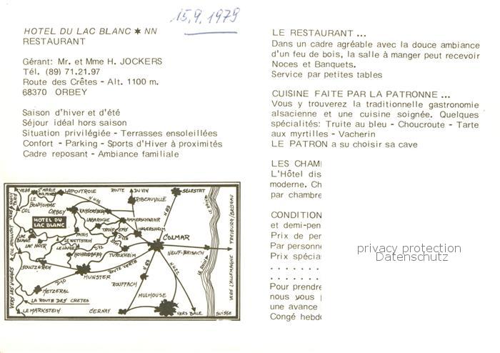 13841435 Orbey Haut Rhin Hotel Restaurant du Lac Blanc Vue aerienne postalisch nicht gelaufen Werbekarte (keine Postkarte) Erhaltung siehe scans [WerneD78] Werbekarte (keine Postkarte) Wern Katcode 11170068568249