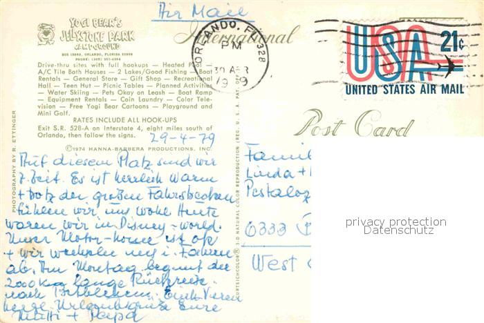 72751064 old postcard Orlando Florida Fliegeraufnahme Yogi Bears Park postalisch gelaufen Erhaltung siehe scans [AndreD76] KatCode: 14140110000000
