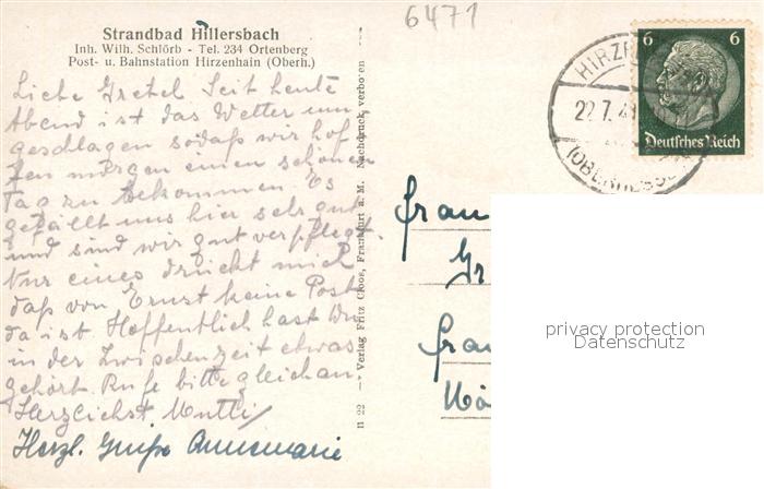 73749353 alte Postkarte Ortenberg Hessen Strandbad Hillersbach postalisch gelaufen Erhaltung siehe scans [WerneD78] KatCode: 11110006440019