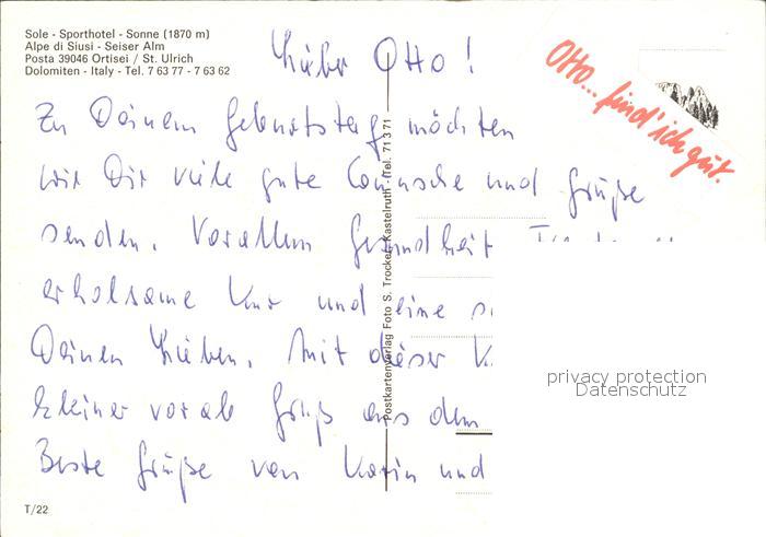 Ortisei St Ulrich Sole Sporthotel Seiser Alm postalisch nicht gelaufen Erhaltung siehe scans