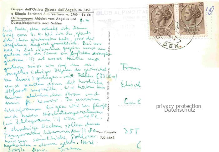 74080155 old postcard Ortlergruppe Trentino-Suedtirol IT Abfahrt vom Angelus und Duesseldorferhuette nach Sulden postalisch gelaufen Erhaltung siehe scans [WerneD78] KatCode: 11240