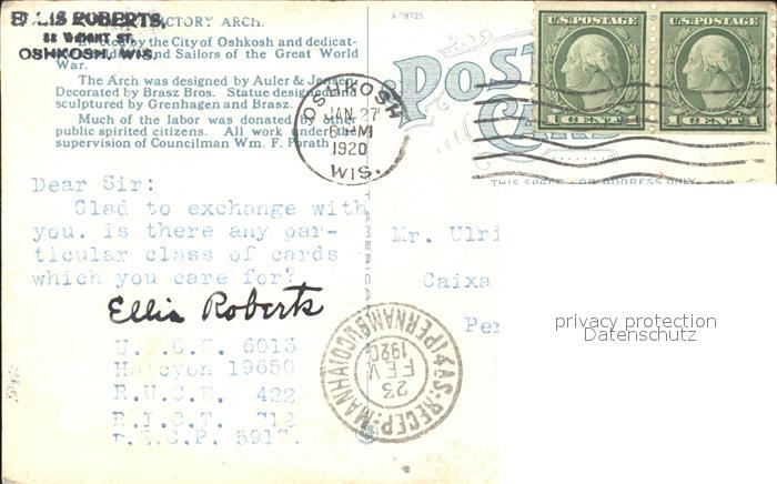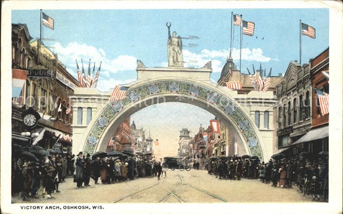 11688730 old postcard Oshkosh Wisconsin Victory Arch Flag postalisch gelaufen Erhaltung siehe scans KatCode: 14140520000000