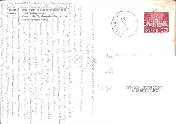 old postcard Oslo Norwegen Parti fra Studenterlunden med Stortingsbygningen postalisch gelaufen Erhaltung siehe scans