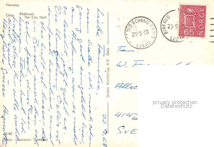 old postcard Oslo Norwegen Radhuset Rathaus postalisch gelaufen Erhaltung siehe scans [FriedD77]