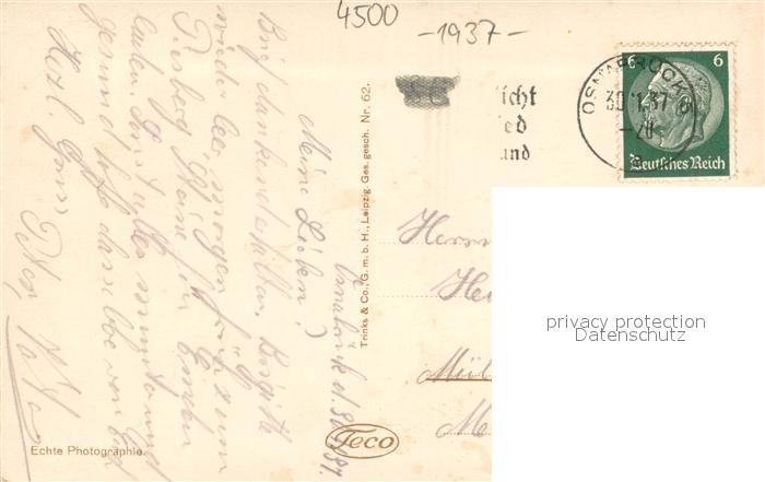 73699290 alte Postkarte Osnabrueck Dom Domhof Agnes Schoeller Haus Vitischanze Nationaltheater Friedenssaal Brunnen am Herrnteichswall postalisch gelaufen Erhaltung siehe scans [FriedD77] KatCode: 11110003404000