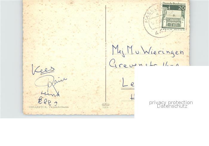 72582138 alte Postkarte Osnabrueck Pernickelturm Holzbruecke Wasserspiegelung postalisch gelaufen Erhaltung siehe scans [FriedD77] KatCode: 11110003404000