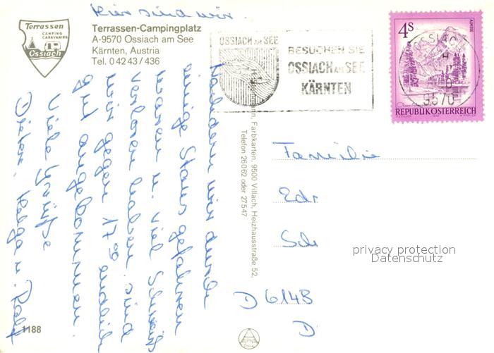 73341569 alte Postkarte Ossiach Gaststaette Terrasse Campingplatz Badestrand Ossiachersee Fliegeraufnahme postalisch gelaufen Erhaltung siehe scans [FriedD77] KatCode: 11390212021006