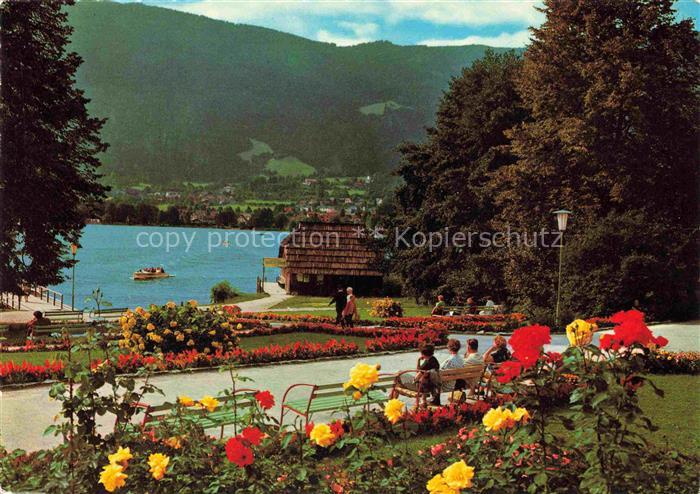 Ossiach Ossiachersee Kaernten AT Blumenanlagen am Landungssteg gegen Bodensdorf
