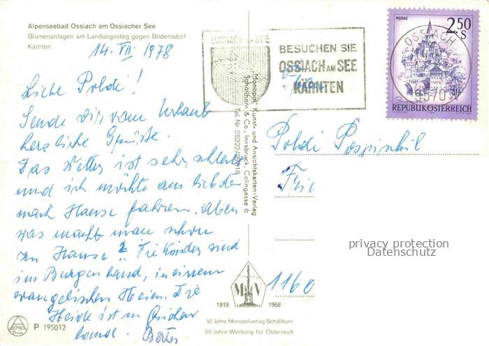 74098803 alte Postkarte Ossiach Ossiachersee Kaernten AT Blumenanlagen am Landungssteg gegen Bodensdorf postalisch gelaufen Erhaltung siehe scans [WerneD78] KatCode: 11390212021006