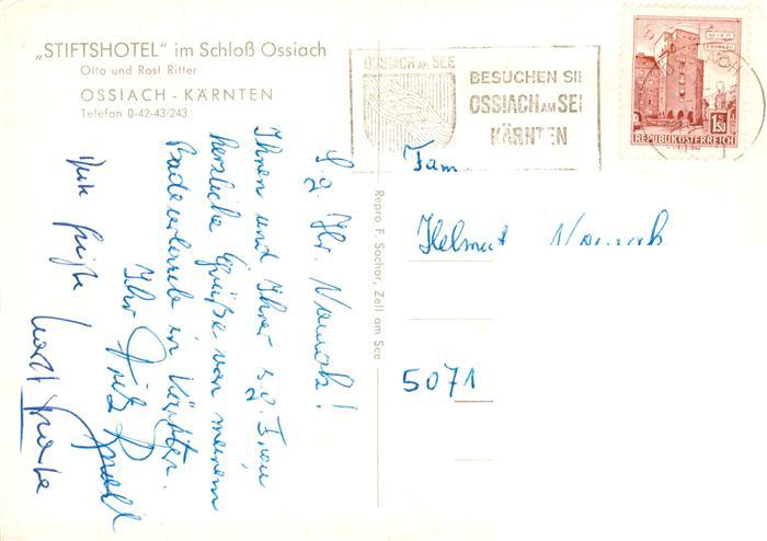 73904770 alte Postkarte Ossiach Ossiachersee Kaernten AT Stiftshotel im Schloss Ossiach Restaurant Terrasse Uferpromenade postalisch gelaufen Erhaltung siehe scans [FriedD77] KatCode: 11390212021006