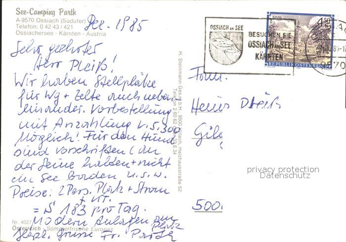 72034358 alte Postkarte Ossiach See Camping Parth postalisch gelaufen Erhaltung siehe scans KatCode: 11390212021006