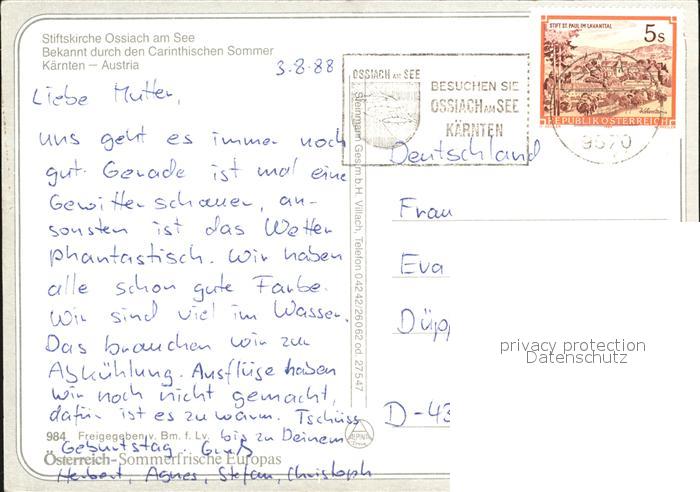 72443162 alte Postkarte Ossiach Stiftskirche postalisch gelaufen Erhaltung siehe scans KatCode: 11390212021006