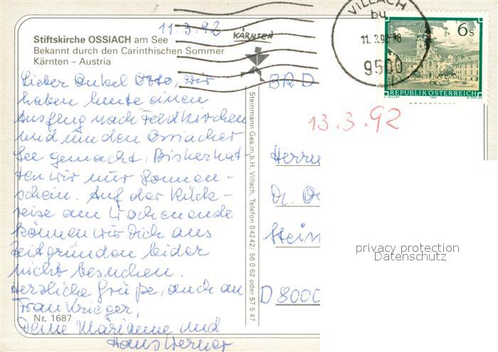 73234376 alte Postkarte Ossiach Stiftskirche Innenansichten Ossiachersee Segelboot postalisch gelaufen Erhaltung siehe scans [FriedD77] KatCode: 11390212021006