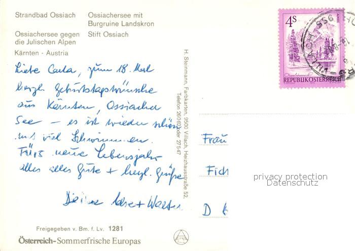 73357623 alte Postkarte Ossiach Strandbad Ossiachersee Burgruine Landskron Julische Alpen Stift Kloster Fliegeraufnahme postalisch gelaufen Erhaltung siehe scans [FriedD77] KatCode: 11390212021006