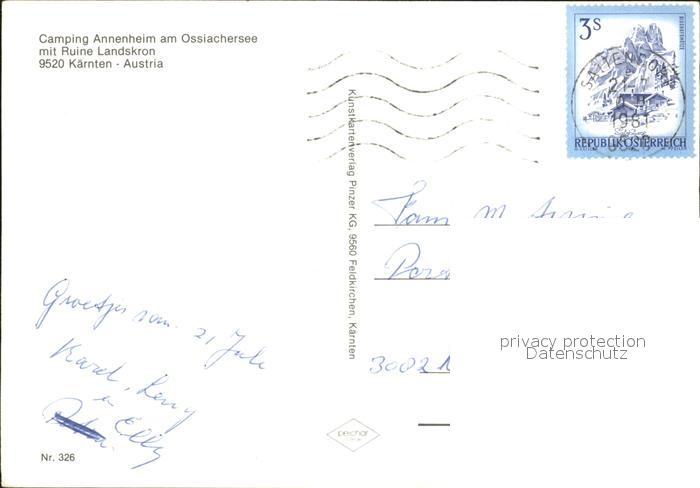72093014 alte Postkarte Ossiachersee Camping Annenheim mit Ruine Landskron postalisch gelaufen Erhaltung siehe scans KatCode: 11390212021006