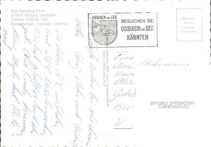 72034550 alte Postkarte Ossiachersee Camping Parth Segelboot Alpen Fliegeraufnahme postalisch gelaufen Erhaltung siehe scans KatCode: 11390212021006