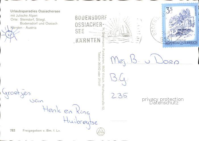 71915767 alte Postkarte Ossiachersee Panorama mit Julische Alpen Steindorf Stiegl und Ossiach postalisch gelaufen KatCode: 11390212021006