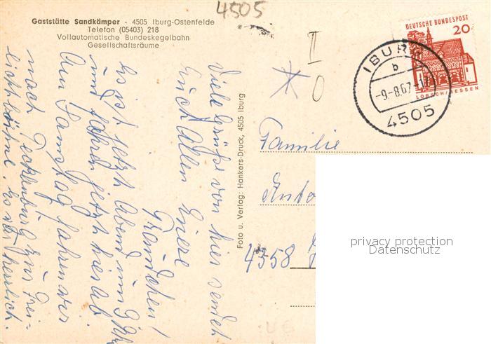 73852500 alte Postkarte Ostenfelde Bad Iburg Gaststaette Sandkaemper Gaststube Kegelbahn postalisch gelaufen Erhaltung siehe scans [WerneD78] KatCode: 11110003459004