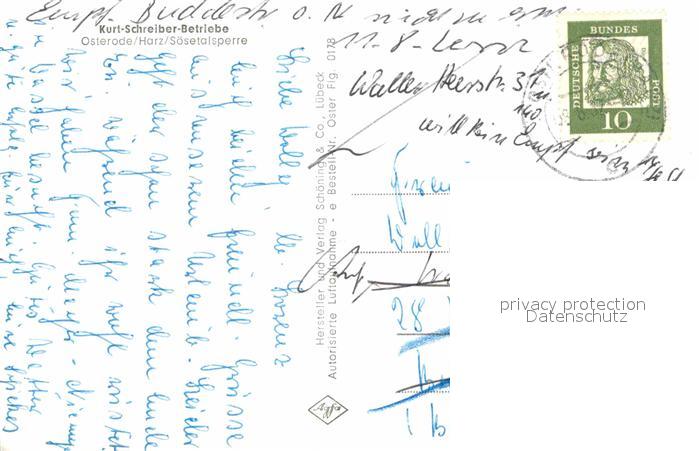 72844512 alte Postkarte Osterode Harz Fliegeraufnahme Kurt Schreiber Betriebe Soesetalsperre postalisch gelaufen Erhaltung siehe scans [KathaD81] KatCode: 11110003156011