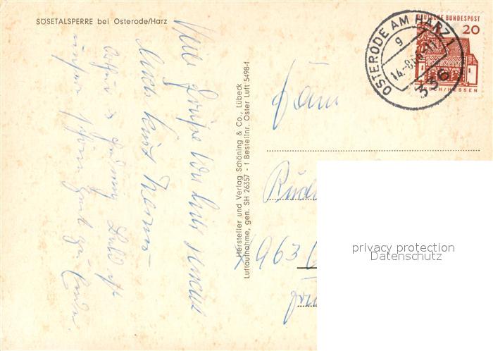 73121182 alte Postkarte Osterode Harz Fliegeraufnahme Sosetalsperre postalisch gelaufen Erhaltung siehe scans [LiesaD40] KatCode: 11110003156011