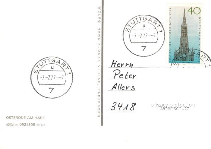 73176456 alte Postkarte Osterode Harz Fontaene im Kurpark Marktkirche Rathaus Soesetalsperre Marktplatz postalisch gelaufen Erhaltung siehe scans [FriedD77] KatCode: 11110003156011