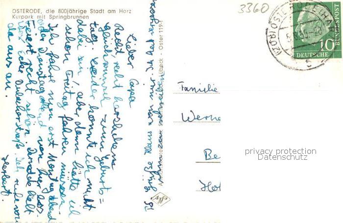43352451 alte Postkarte Osterode Harz Kurpark mit Springbrunnen postalisch gelaufen Erhaltung siehe scans [WerneD78] KatCode: 11110003156011