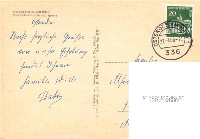 73600036 alte Postkarte Osterode Harz Kurt Schreiber Betriebe Soesetalsperre Fliegeraufnahme postalisch gelaufen Erhaltung siehe scans [FriedD77] KatCode: 11110003156011