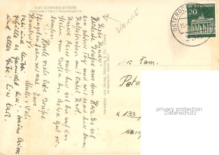 73779729 alte Postkarte Osterode Harz Kurt Schreiber Betriebe Soesetalsperre postalisch gelaufen Erhaltung siehe scans [WerneD78] KatCode: 11110003156011