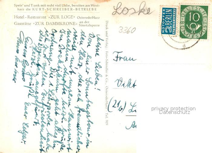 73169423 alte Postkarte Osterode Harz Soesetalsperre Gaststaette Zur Dammkrone postalisch gelaufen Erhaltung siehe scans [FriedD77] KatCode: 11110003156011