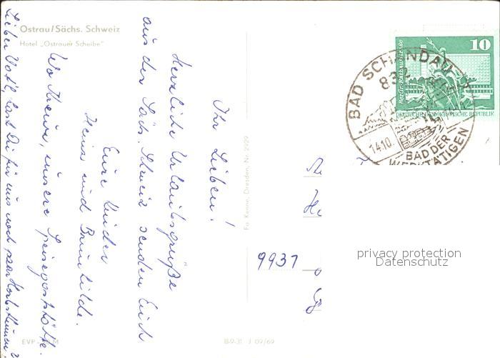 72512947 alte Postkarte Ostrau Bad Schandau Hotel Ostrauer Scheibe Gastraum Panorama postalisch gelaufen Erhaltung siehe scans KatCode: 11110014287020
